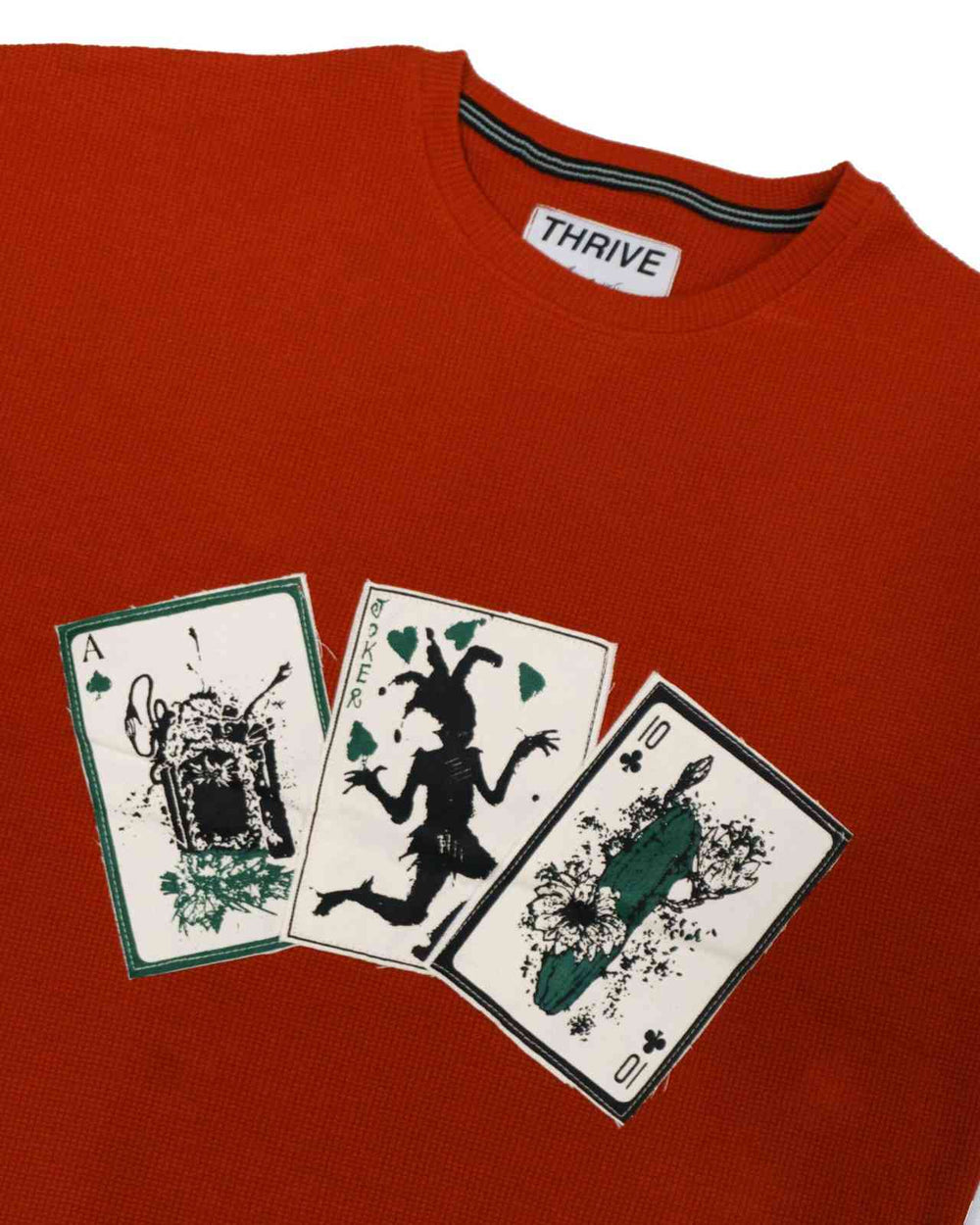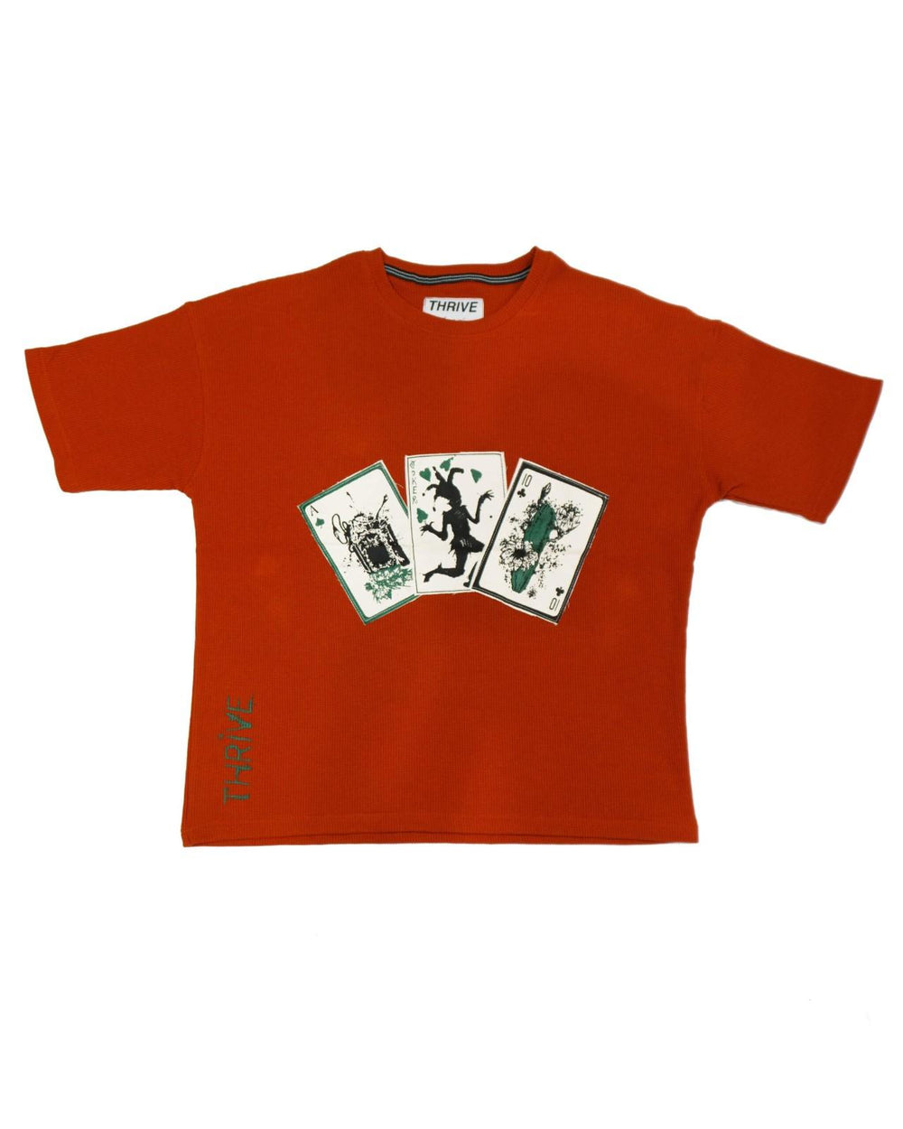 This garment features a patchwork of playing cards with intricate illustrations symbolizing life’s dualities, made from premium waffle knit fabric for comfort and reflection. Vibrant motifs and somber imagery evoke the contrast between vitality and mortality, making this shirt a conversation piece in the grand game of existence.