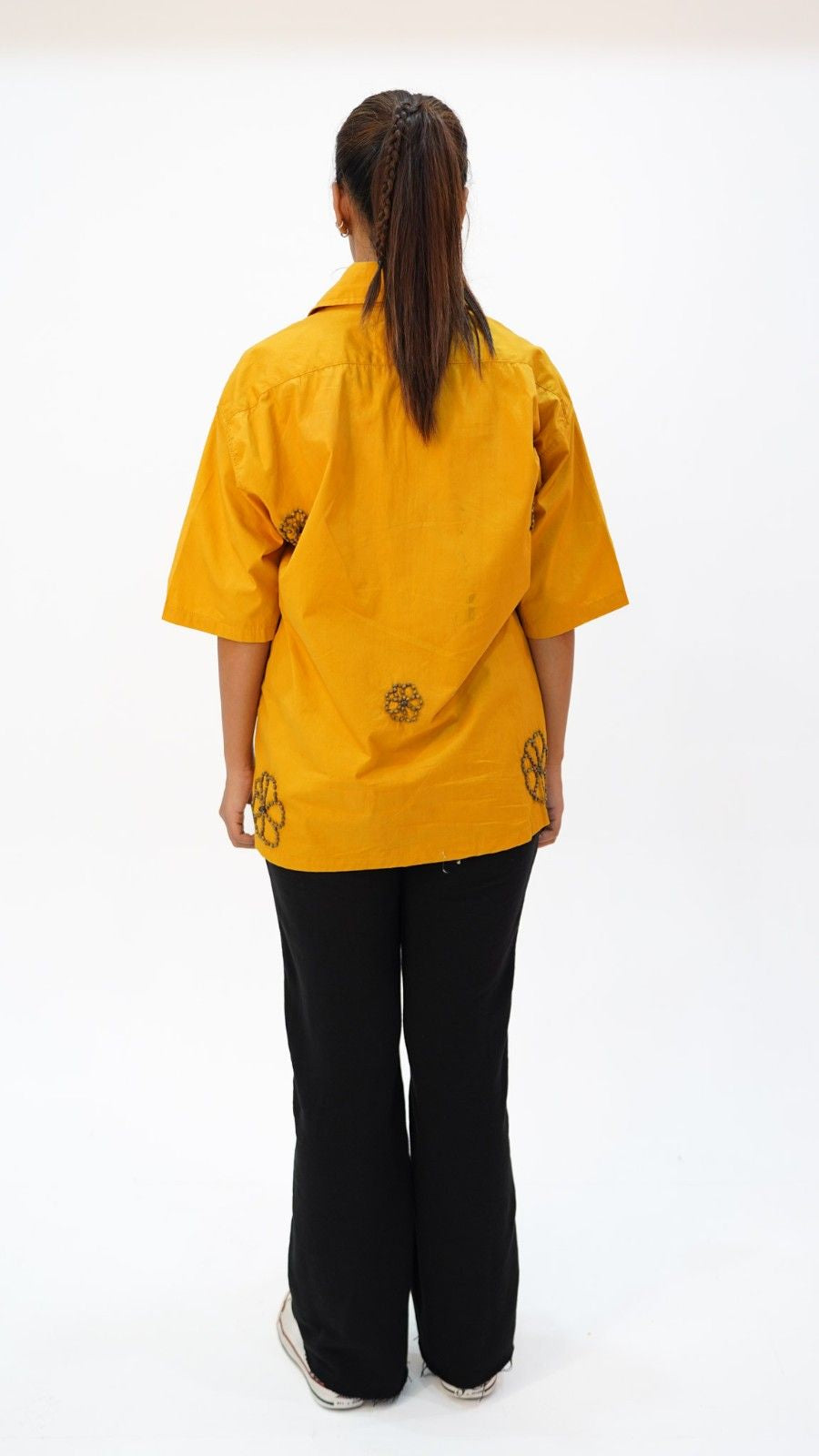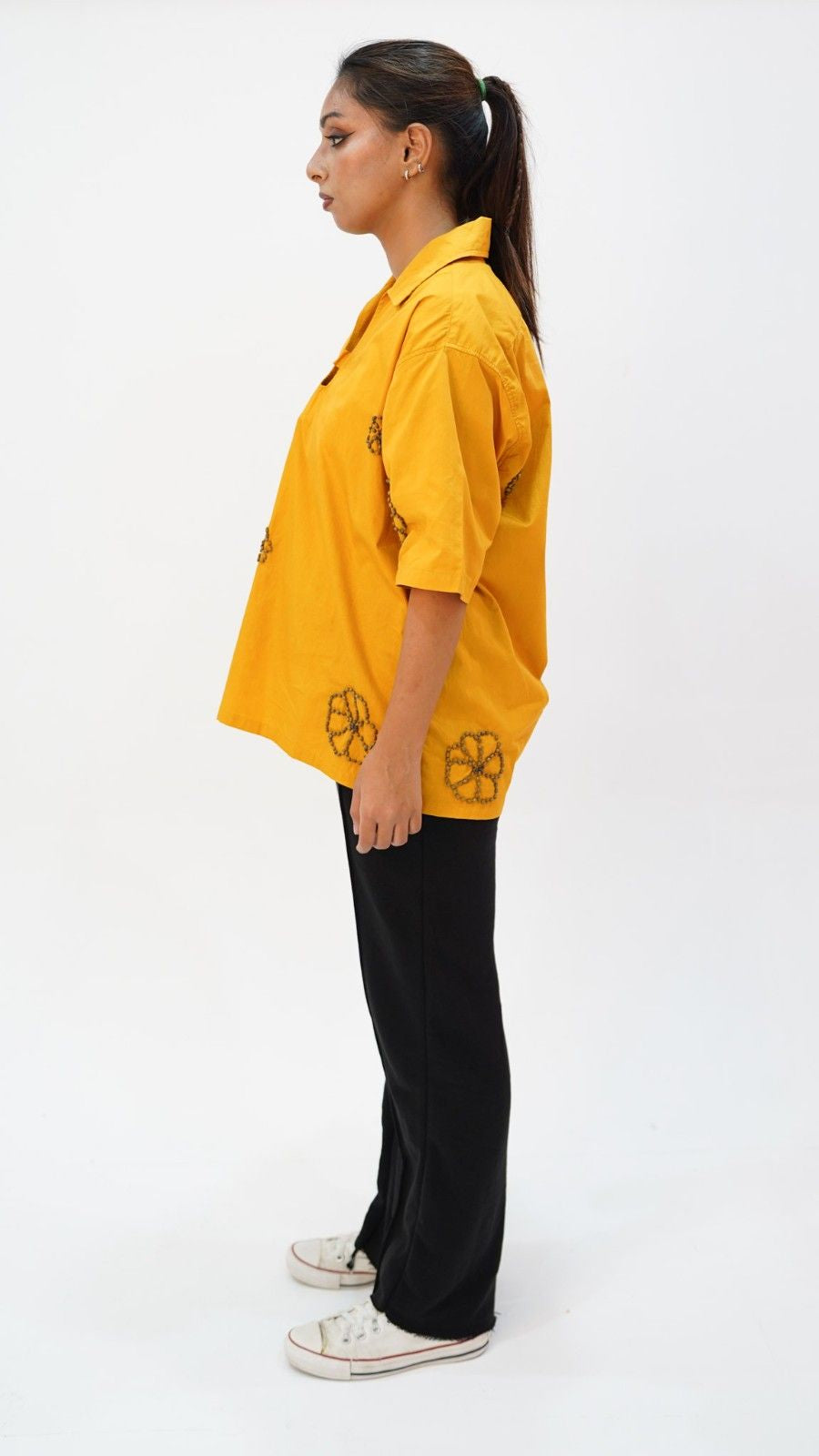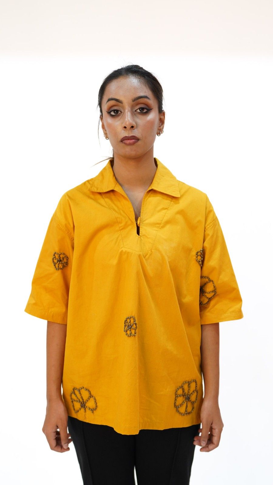 The Gulbahar shirt features intricate floral beadwork embroidery, this mustard-hued shirt is inspired by the timeless beauty of blooming gardens of lahore.